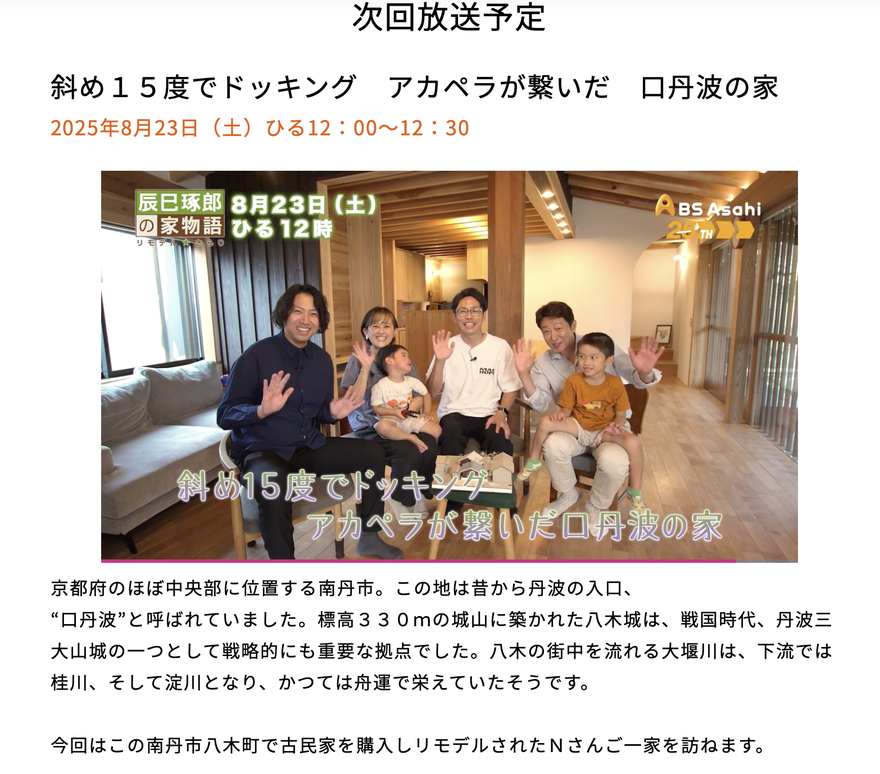 設計業務 テレビ出演のお知らせ 前回のブログにて取材の報告をしました、南丹市のいえのテレビ番組の詳細です。よろしければご覧ください。 お忙しい中、お時間を割いてくださった関係者方々、貴重な経験をさせていただき、本当にありがとうございます。 これからもよい家作りに励んでまいります。 ホームへ 南丹市のいえ お問い合わせ tagPlaceholderカテゴリ: